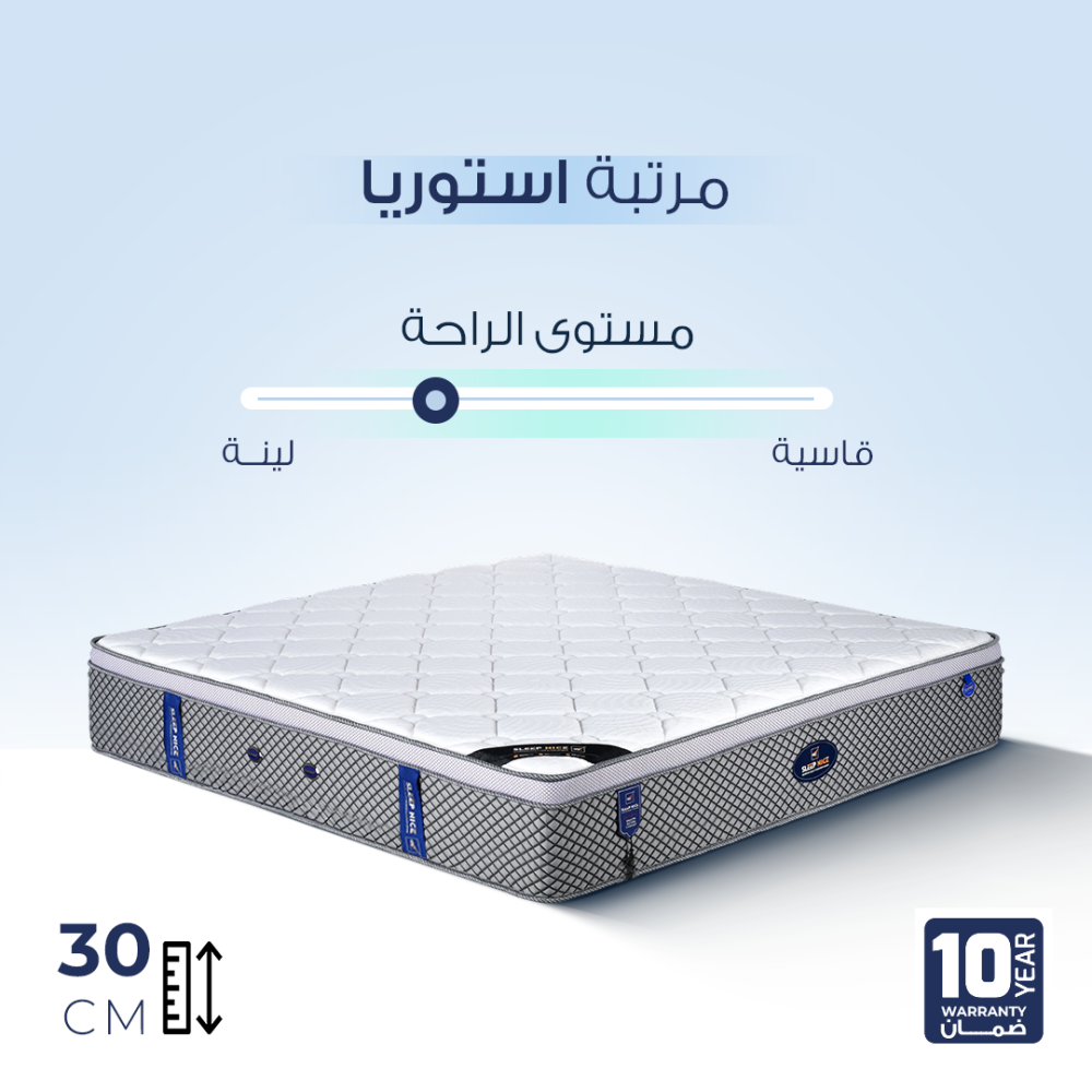 مرتبة أستوريا صُممت بعناية لتمنحك تجربة نوم فاخرة وصحية بفضل مزيج متوازن من الدعم الطبي والراحة الفائقة. بارتفاع 30 سم وتقنية النوابض المنفصلة، تُعتبر خيارًا مميزًا لمختلف أنماط النوم والأوزان.