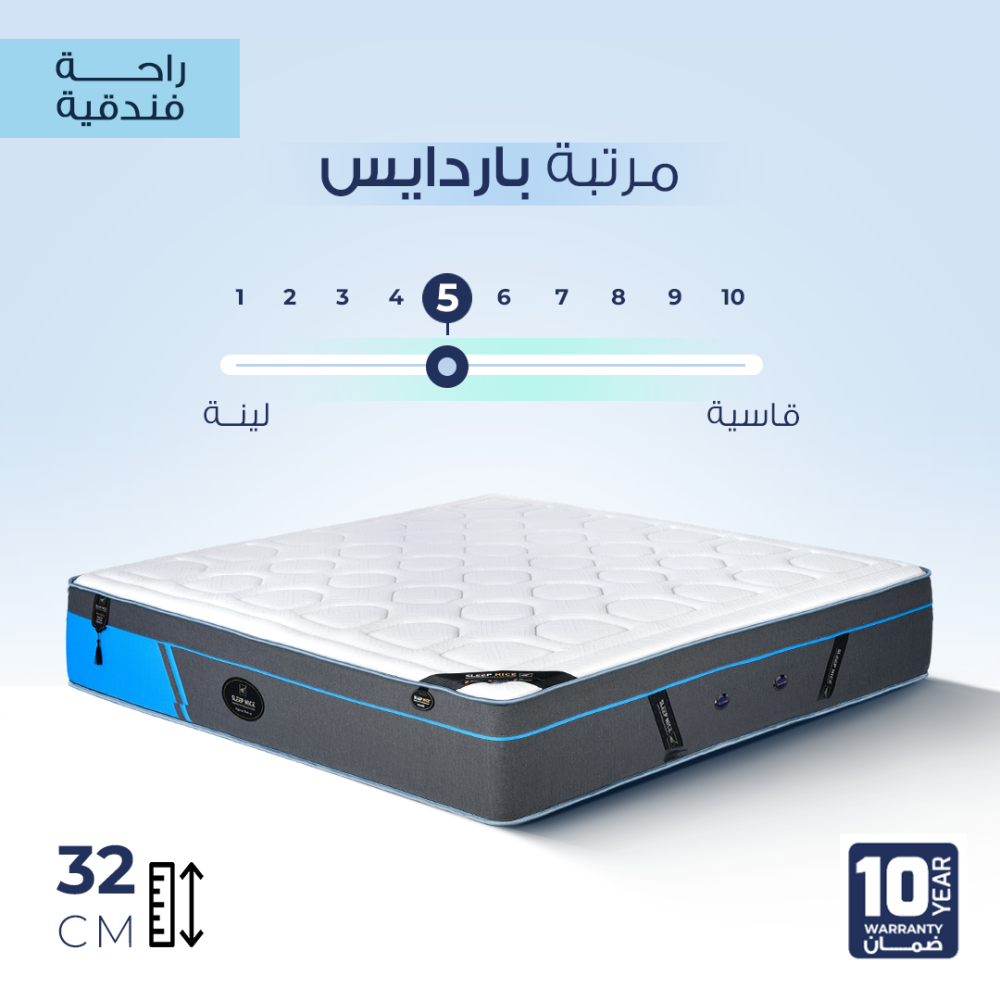 مرتبة باراديس الفاخرة بارتفاع 29 سم تجمع بين تقنيات التبريد الحديثة والدعم المثالي للجسم، لتمنحك تجربة نوم صحية ومريحة في كل ليلة. بفضل تصميمها المتطور وجودة خاماتها، تُعد هذه المرتبة خيارًا ممتازًا لكل من يبحث عن الراحة الفاخرة مع دعم متوازن.