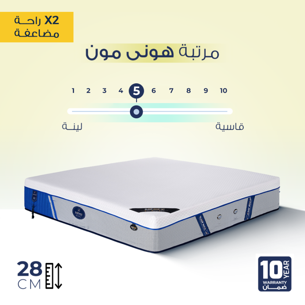 مرتبة هوني مون هايبرد بارتفاع 28 سم تقدم لك مزيجًا فريدًا من الراحة والفخامة بفضل تصميمها المستوحى من الطبيعة وتقنياتها الحديثة. تتميز هذه المرتبة بمواد طبيعية وتقنية تبريد متطورة تمنحك نومًا هادئًا وصحيًا كل ليلة.